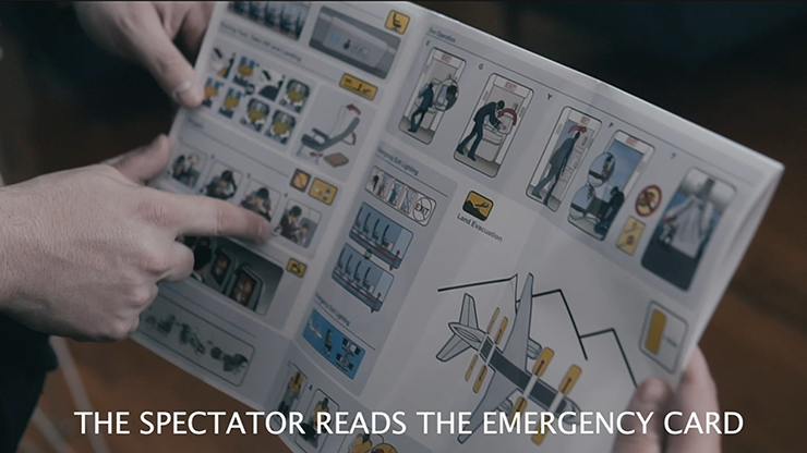 At the beginning the magician handed over an emergency card and asked the spectator to read it, but did the spectator really read it? Now when the emergency card is opened you can see in the drawings of the entire printed card everything that has just happened, all the "free choices" of the spectator are printed on the card and even better to be more sure, now the magician opens the card and it becomes a giant poster that reveals everything that just happened in the routine!