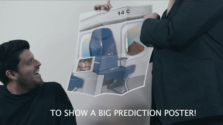 The magician now shows a tray with a bag and invites the spectator to say out loud the drink he has chosen (example: whiskey). When the magician lifts the paper bag, he has failed because there is only one orange box juice there. Now the magician continues and ask him to take the airplane magazine that has all the movies available inflight and to please secretly choose one. Now he asks him to focus on the film, the main actor, the soundtrack and other details, magically the magician begins to read the spectator's mind revealing one by one all the things he is thinking. Then the magician guesses the exact number of the airplane seat where he is on, his boarding group and finally the destination of the flight, city and country he is traveling to. At the end magician finishes with a question.