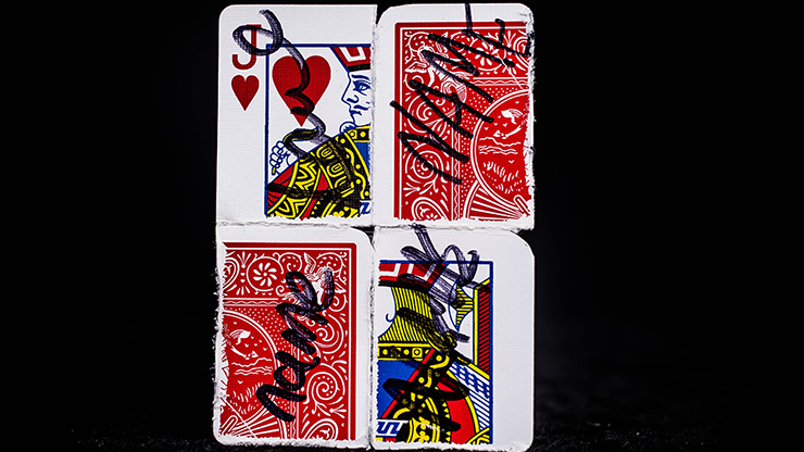 With no palming and nothing hidden in the hand any court card is cleanly and openly torn into four quarters. The spectator shuffles and rotates the pieces to mix them up.