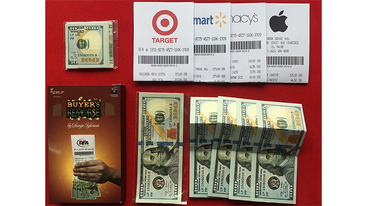 You show a receipt in your hands. You fold it twice and turn it over and just like magic, you're holding a bunch of bills that you can fan out front and back and count individually. Creator, George Iglesias, pays tribute to his magic mentor, the great José "Pepe" Sousa, with this very visual magic trick that you can also make up with your own money and receipts! Buyer's Remorse comes with a gimmick already made for you with 4 realistic-looking hundred-dollar bills. It's very easy to do. Take it out of the pack and you will be doing this right away!