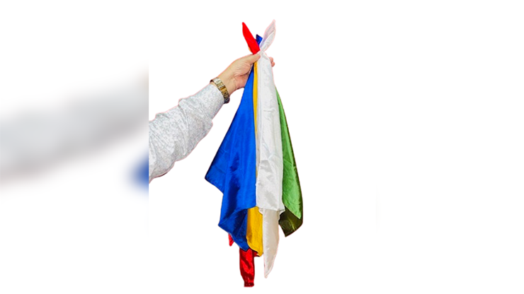 The magician holds four different color silk handkerchiefs bunched together near one corner. One hanky is pulled out, folded, and placed in the pocket. The remaining hankies are crumpled into a ball. Moments later, the magician stretches the "hankies", which magically blends into a single large four-colored foulard.