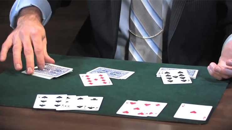 This is a gambling demo that will bring the house down. The performer shuffles the deck twice and deals himself the four queens. His opponent has the four kings. When the performer shows his hand again it's turned into the four aces.