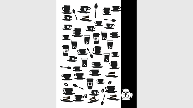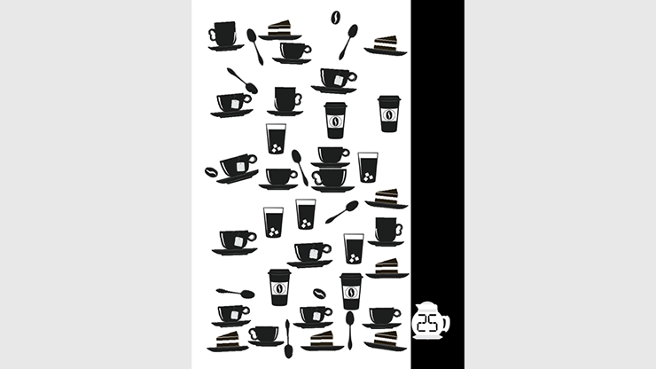 A packet of double sided game cards from the game Cafe Counter that displays a messy counter of cafe cups are introduced. Every side of every card depicts a different collection of beverages and treats that include tea cups, coffee mugs, water glasses, togo cups, cakes, spoons, and coffee beans splattered randomly about. The performer asks that the cards be mixed and one be held up. With a mere glance, the performer correctly counts and names the total number of cups and glasses on the card. As an aside the performer also correctly states how many of those cups are filled with coffee and how many of them are orders "togo." Next the performer attempts that this be done with two cards and again successfully and quickly counts the total number with a mere glance. Next more of the cards are used and randomized to the same success, but this time the performer not only counts the total number of cafe cups but also identifies the finer details about the total collection. This can include the number of water glasses, the number of teacups, the number of spoons, number of coffee mugs, number of togo cups and even the total number of cakes! To finish the participant randomizes a final set of cards and counts the cups that are showing in secret and hides the faces of all of the cards from view. Now the total only exists in the participants mind and the performer successfully pulls this final count out of the participants head to a successful conclusion.