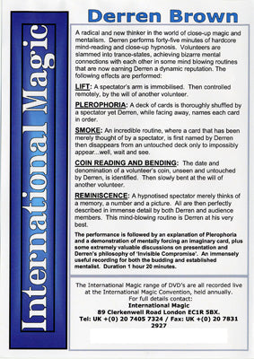The performance is followed by an explanation of Plerophoria and a demonstration of mentally forcing an imaginary card, plus some extremely valuable discussions on presentation and Derren's philosophy of 'Invisible Compromise'. An immensely useful video for both the budding and established mentalist.