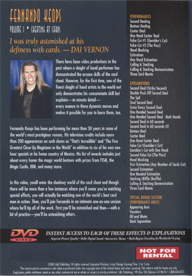 There have been video productions in the past where a sleight of hand performer has demonstrated the arcane skills of the card cheat. However, for the first time, one of the finest sleight of hand artists in the world not only demonstrates his consummate skill but explains-in minute detail-every nuance in these dynamic moves and makes it possible for you to learn them, too. In this video, you'll enter the shadowy world of the card cheat and though there will be more than a few instances where you'll swear you're watching special effects, you will actually be watching one of the world's best card men in action. Then, you'll join Fernando in an intimate one-on-one session where he'll tip all of the work. First you'll be astonished and then-with a bit of practice-you'll be astonishing others.