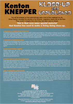 This is the very same special material the Kenton has used to make a living doing close-up. This DVD comes with five routines that vary from coin tricks, mentalism, sponges, and cards. Kenton will show you how to preform these tricks like he does...