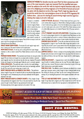 For decades the name Pavel has been synonymous with some of the most innovative magic ever invented. Pavel has mystified and entertained lay audiences the world over with his inspired magical inventions while at the same time, delighting and exciting magicians at his thousands of lectures all around the globe with the diabolical secrets of his magic. Pavel's magic has taken him around the world, from the most prestigious venues to the set of TV's legendary Ed Sullivan show...and now he's sharing his award-winning magic, and the ingenious thinking that makes it all work, with you!
