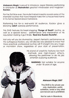 Not only will you be stunned by Jasper's fantastic performance as the outrageous Kockov, you will also be very pleased to know that these practical, professional routines will fit straight into any magic or mentalism show, regardless of your style of presentation. His brand of creativity features low-tech methods and high-impact effects, allowing the performer to do his job: entertain a paying audience.