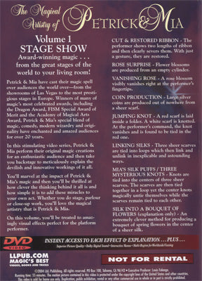 Petrick & Mia have cast their magic spell over audiences the world over-from the showrooms of Las Vegas to the most prestigious stages in Europe. Winners of many of magic's most celebrated awards, including the Dragon Award, FISM Special Award of Merit and the Academy of Magical Arts Award, Petrick & Mia's special blend of magic, comedy, modern wizardry and originality have enchanted and amazed audiences for over 20 years. In this stimulating video series, Petrick & Mia perform their original magic creations for an enthusiastic audience and then take you backstage to meticulously explain the devilish and innovative workings of it all. You'll marvel at the impact of Petrick & Mia's magic and then you'll be thrilled at how clever the thinking behind it all is and how simple it is to add these miracles to your own act. Whether you do stage, parlour or close-up work, you'll love the magical artistry that is Petrick & Mia.