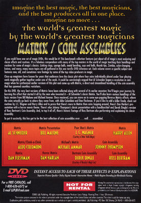 On this DVD, the very best versions of Matrix have been collected along with several of its earlier ancestors. You'll begin your journey by learning the effect that started it all by the man who invented it - Al Schneider's classic Matrix. You'll also learn various handlings of the basic version from Bill Malone and Michael Ammar. Once mastered, you can move on to some eye-popping Reverse Matrix effects, where the coins actually go back to where they came from, with Aldo Colombini and Dan Fleshman. If you'd like to add a killer finale, check out routines by J.C. Wagner and Harry Allen and to prove that there's more to Matrix than coins hopping around, there's Dan Harlan's presentation with a horror movie theme. There's also Johnny Thompson's classic presentation with a handkerchief and Derek Dingle's version of Ross Bertram's Coin Assembly. And, to top it all off, there's historic footage of Ross Bertram also performing and explaining his classic Assembly.