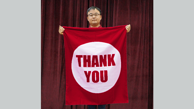 Instantly the magician transforms the flowers into a large, full-sized banner that says, "thank you".