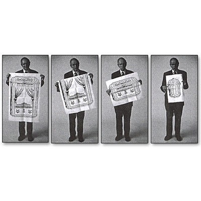 With that, the performer displays a large (25" wide by 38" tall) sheet depicting an embossed casket with an Austrian carved canopy and French velvet drapes and continues, "This guy said, 'Look, we can give you this beautiful casket for only $190,000.' That's really more than I can afford, I said." and with that he folds the top section of the sheet down, eliminating the carved canopy on top.