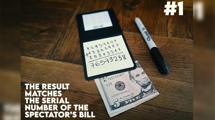 You ask a spectator for a bill and you exchange it for a business card that you take from the notebook. Then you ask different spectators to write random numbers and finally you give the notebook to the owner of the bill to add up them. One he has done it he opens his bill himself and confirms that the result matches the serial number. Incredible but real!