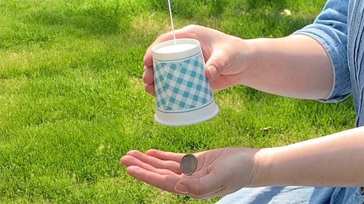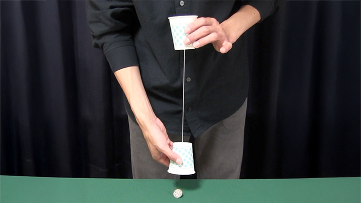 Fill one cup with a coin and hold the other cup upside down. When you play with a yarn phone, you have to taut the thread, and when the thread is stretched vertically, the coin appears from the cup on the opposite side. There is nothing left in the cup with the coin in it.