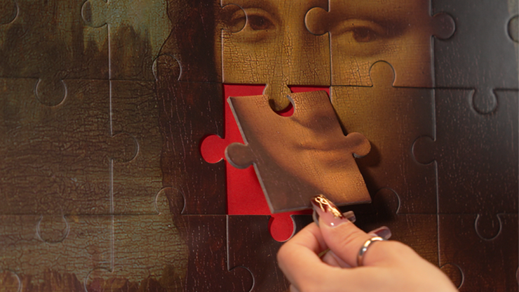 The shroud is lifted from the frame revealing a puzzle depicting a famous painting. It does not match the spectator's choice though. No problem! The magician once again covers the frame, and, pulling the shroud once more, reveals that the puzzle has transformed to match the selected card. There is just one piece missing. The single piece that the audience member just happened to have selected at the start!
