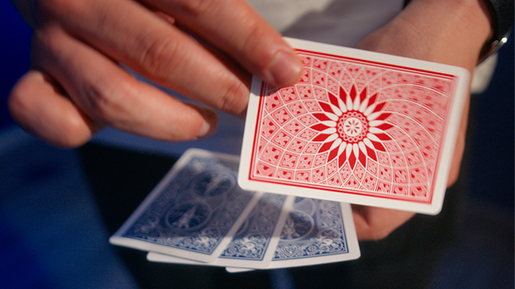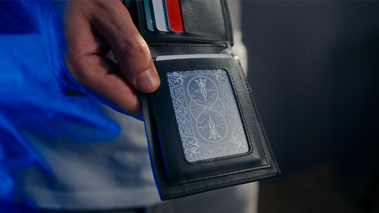 Your spectator freely names any value, from Ace to King. You remove a set of cards from your wallet, which holds not only the cards but also your cash and bank cards, enhancing its authentic look. Then, the spectator is asked to select a color, and then a suit. As the cards are spread in your hands, the spectator's chosen card is the only one face-up among the others. But the astonishment doesn't end there: it's the only card with a red back, while the others have blue backs, and they are blank on the face: these cards were never real!