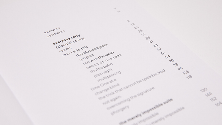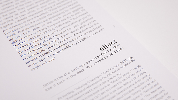 This book is broken into two main parts. The first of which features Michael's go-to effects. These are the routines he performs regularly in both his professional and casual work. There are innovative routines like "False Dichotomy" where two people seemingly experience the same card trick differently before both realities are proven to be true, as well as fun and quirky takes on classics like Card Under Glass and Triumph.