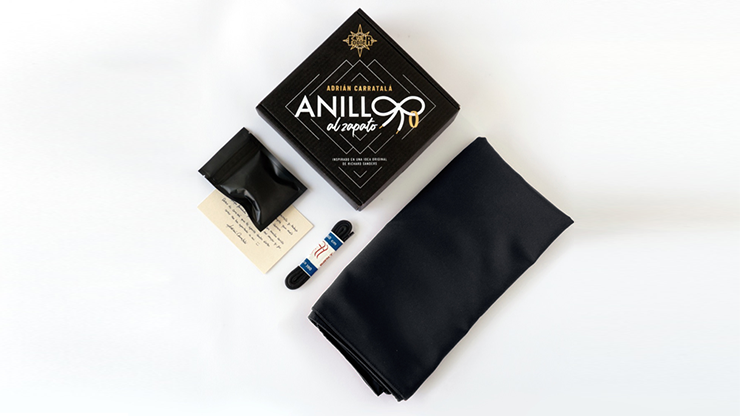 Effect: A borrowed ring disappears under a handkerchief and immediately appears tied to the magician's shoelace.