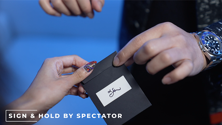 The magician displays an envelope and a blank card, places the blank card inside the envelope, and has a spectator sign in the window of the envelope.