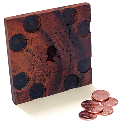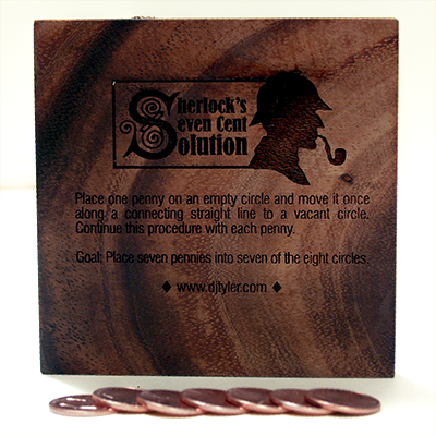 This is a nice wooden puzzle is custom designed. It measures 3.75 x 3.75 inches and fits into the palm of your hand. The seven pennies are included. The object is to start on a vacant circle and to move it once along a connecting line to another empty circle. This must be done with all seven pennies leaving the eighth hole vacant. Most people can do four or five pennies, but doing all seven takes a knack. This makes a great gift. Limited supply.