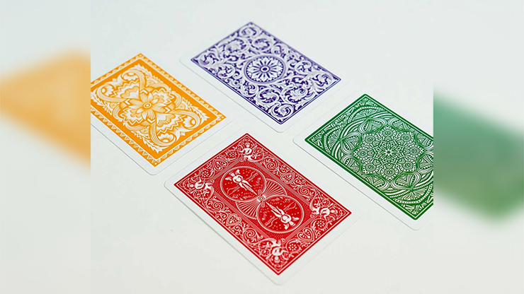 Witness as three selections impossibly share the exact same value as a fourth card chosen at random! Surely that would only be possible if these four cards came from four different decks?! Well, that turns out to be true, because the backs of three cards then change from red to green, yellow and purple!