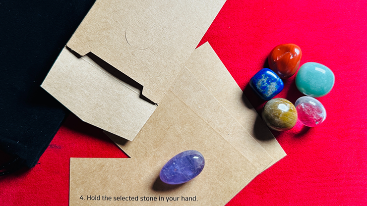 First, you give the spectator something and tell them to hold it tightly in their hand or put it in their pocket without looking at it. You then show them six beautiful stones and a pouch and ask them to check everything. Now you show four envelopes, take out the instructions written inside them, and read them together. The magician doesn't touch at all, and the audience does everything as written in the instructions. The spectator freely takes out three stones, chooses their favorite, and holds it tightly in their hand. Do you remember something you gave to the spectator at the beginning? Now take it out and check it, and the same stone has been predicted correctly!