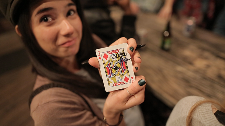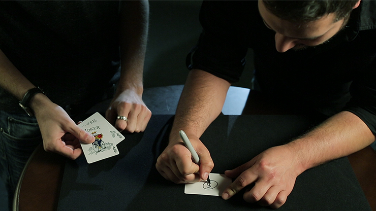 A blank card is shown front and back. The spectator draws a picture of a coin, like a quarter or half dollar, on the blank card. The Jokers are introduced as money makers. The card with the drawing on it is placed in between the jokers, and with a magical wave, a coin slides out from the jokers and the card with the drawing has vanished.