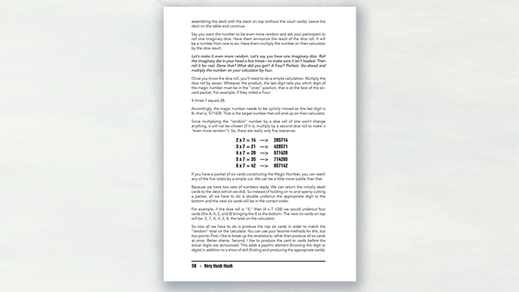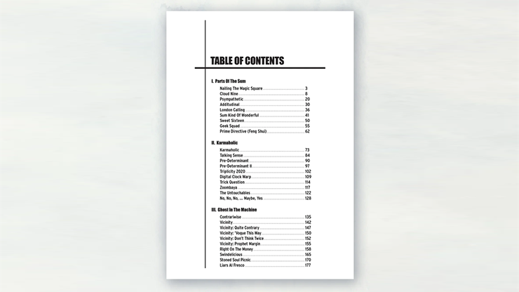 And you've never seen a magic square quite like this. The first chapter of Very Hush-Hush "Parts of the Sum," deals directly with Bannon's brilliant pasteboard-driven takes (yes, more than one) on this classic mental mind-bender, and allied effects. One method allows you to "predict" a magic square, while another uses no numbers at all. You read that right.