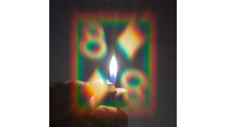 A card is selected and lost in the pack of cards. Ask a second spectator to put on a pair of SPEX GLASSES. Borrow a lighter or smartphone, and ask this second spectator what he sees through the glasses. He'll see the card visibly MORPH on the flame of the lighter or smartphone light as if it were a ghost vision. The card's name eerily appears!